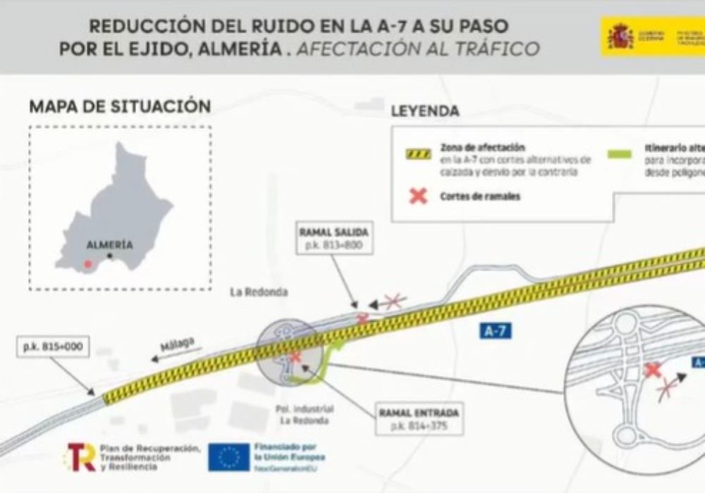Afectaciones al tráfico en la A-7 a su paso por El Ejido por obras para reducir el ruido. Se cortará primero la calzada en sentido Málaga y después la de sentido Almería, entre los kilómetros 812,8 y 815, desviando el tráfico por la calzada opuesta.